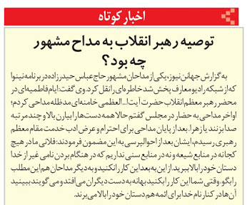 فاطر 14 ، آیت الله خامنه ای : شما [مداحان] از حنجره استفاده میکنید، که نعمت خدا است؛ از لحن و آهنگ استفاده میکنید، که نعمت خدا است؛ از شعر استفاده میکنید، که قریحهاش نعمت خدادادِ الهى است. این نعمتها در اختیار شما است؛ اینها را در خدمت چه قرار میدهید؟ در خدمت معرفتافزائى. اگر در خدمت اختلافافکنى واقع شد، اگر در خدمت تحریک عصبیتهائى قرار گرفت که امروز به خاطر این عصبیتها، متعصبین لجوج در نقاطى از دنیا بیست تا، سى تا سر میبُرند، این استفاده، استفادهى بدى است؛ این را خیلى مراقب باشید.