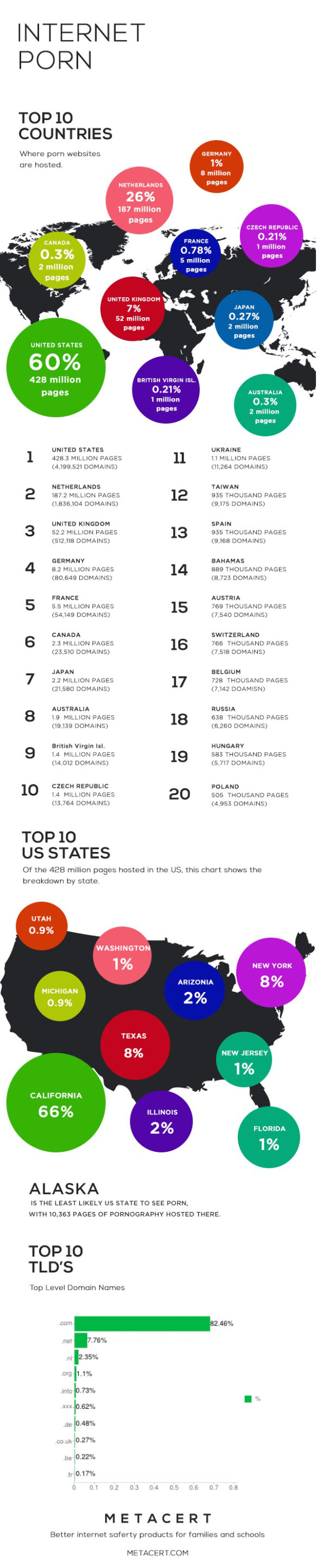 ایالات متحده آمریکا با 428 میلیون، هلند با 187 میلیون و انگلیس با 52 میلیون در رتبههای اول تا سوم کشورهای دارنده صفحات مستهجن هستند.